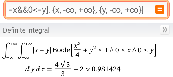 输入: Integrate[(abs(x-y)) Boole[x^2/4+y^2<=1&&0<=x&&0<=y],{x,|s-∞,+∞\verb|}, {y,|-∞,+∞\verb|}]