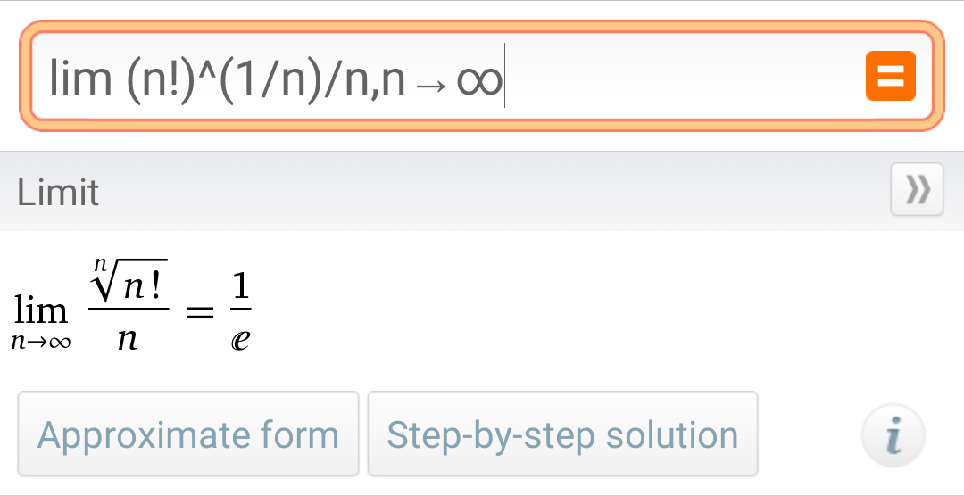 输入: lim (n!)^(1/n)/n,n→∞